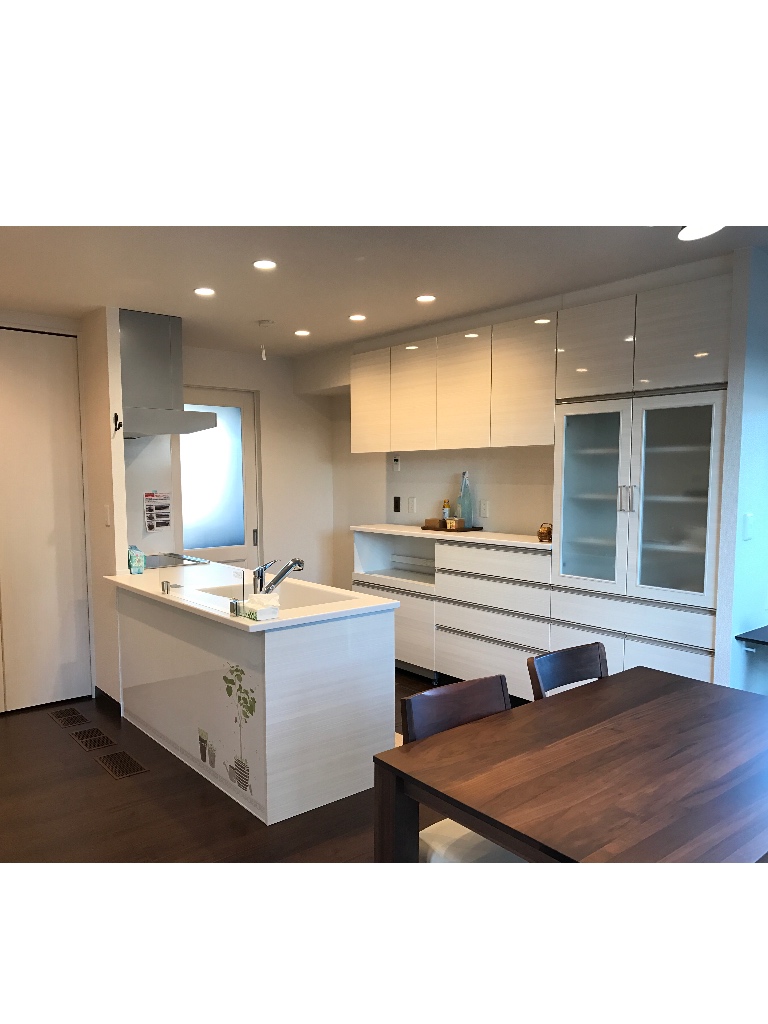 うちのキッチンは昼は日光でまっちろけですが、夜はダイニングと共に温白色になります。